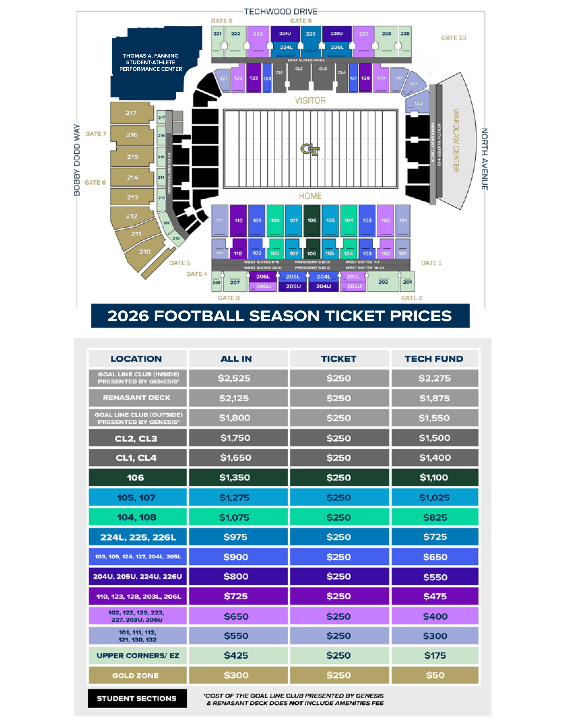 In addition to the highly anticipated matchups with Colorado and Tennessee, Georgia Tech’s 2026 home schedule includes Atlantic Coast Conference games against Boston College, Duke, Louisville and Wake Forest and a non-conference contest against in-state foe Mercer. All season tickets cost $250, plus a required contribution to the Tech Fund, based on seating location. The all-in price for a seven-game season ticket starts at just $300.