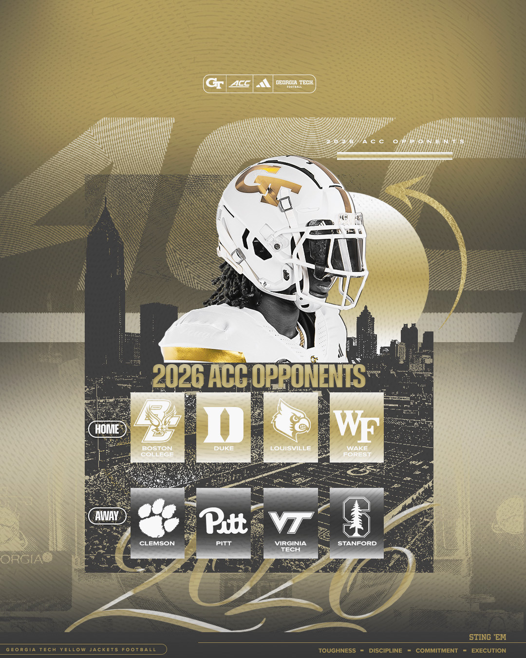 Georgia Tech will continue to play an eight-game ACC schedule in 2026, with home games against Boston College, Duke, Louisville and Wake Forest and road contests at Clemson, Pitt, Stanford and Virginia Tech. These opponents remain unchanged from the schedule model that was announced in 2023 to accommodate Cal’s, SMU’s and Stanford’s additions to the ACC.