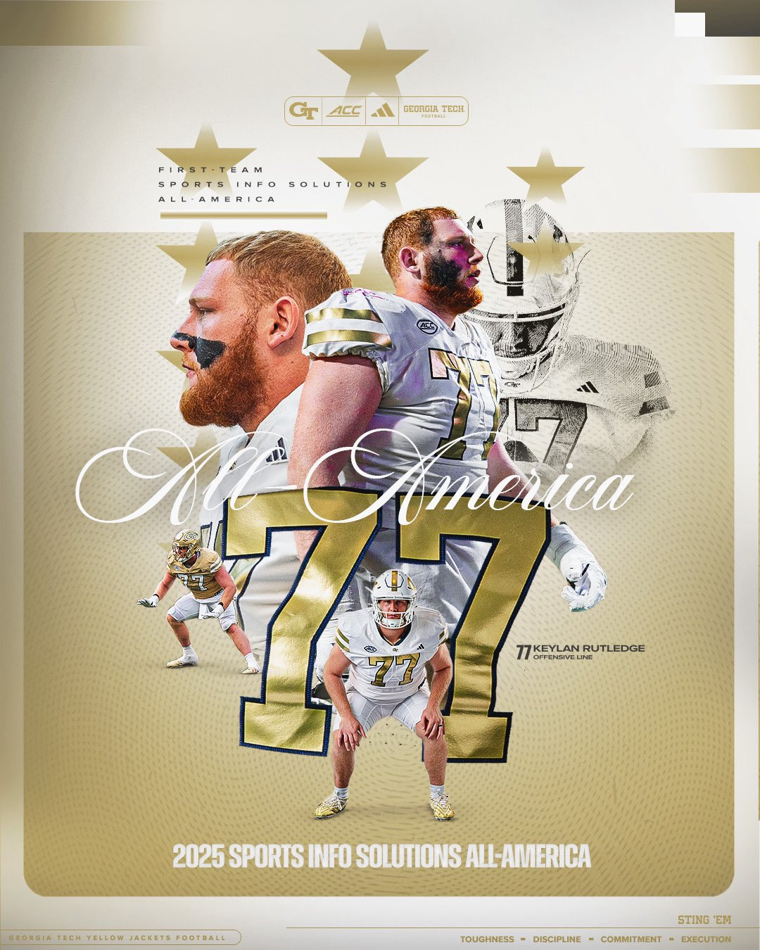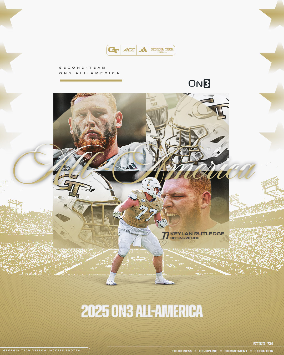 Rutledge is an SIS first-team all-American for the second-straight year, making him the first Yellow Jacket to earn first-team all-America honors in consecutive years since College Football Hall of Famer Calvin Johnson in 2005 and 2006. Rutledge is the first Jacket to receive all-America recognition of any kind in back-to-back years since OL Omoregie Uzzi in 2011 (second team) and 2012 (third team).