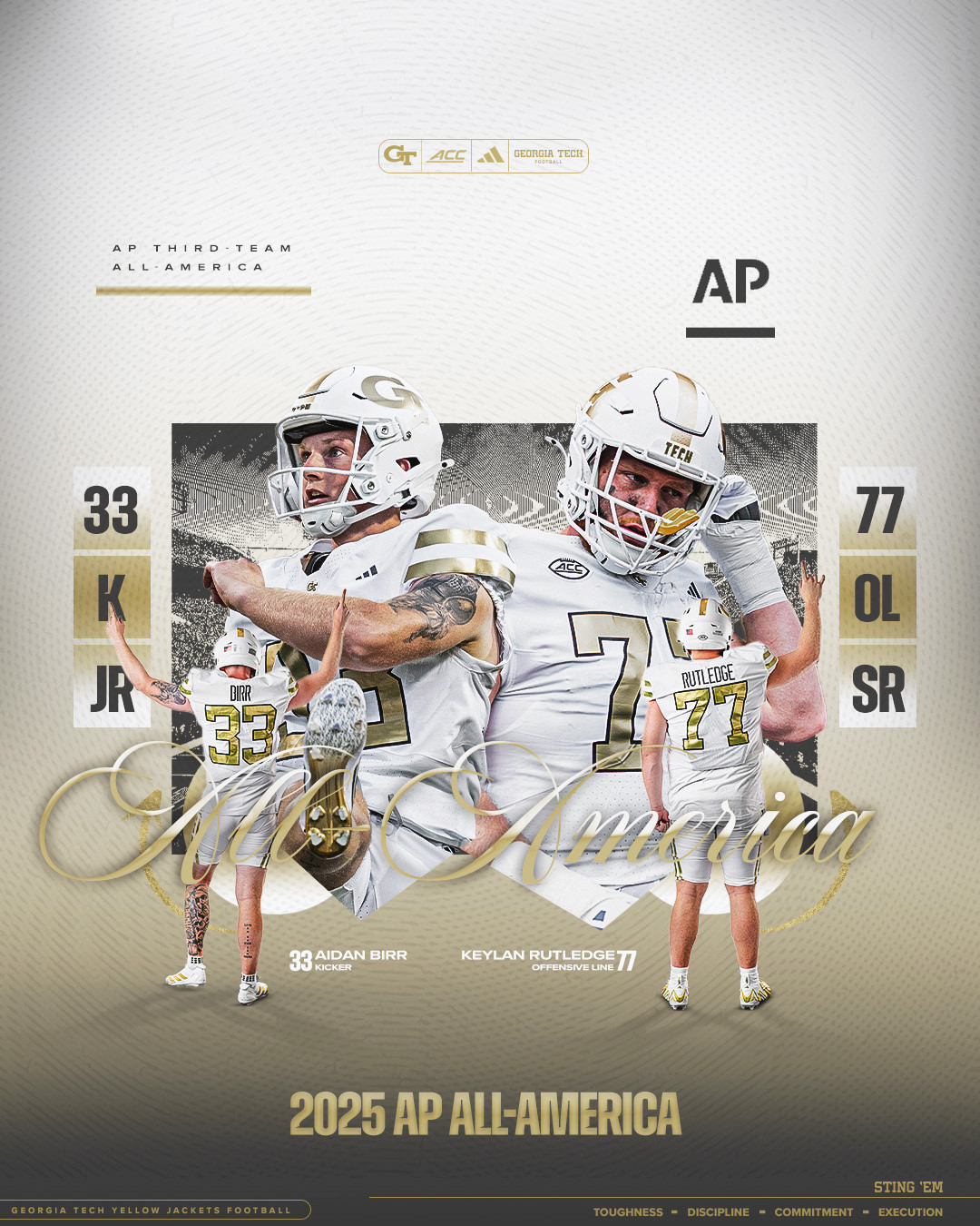 THE FLATS – Georgia Tech place kicker Aidan Birr (Kennedale, Texas/Kennedale H.S.) has joined offensive guard Keylan Rutledge (Royston, Ga./Franklin County) as All-Americans in 2025, with both Yellow Jackets receiving third-team recognition from the Associated Press this week. Rutledge also added to his growing list all-America honors when he was named a second-team all-American by the American Football Coaches Association.