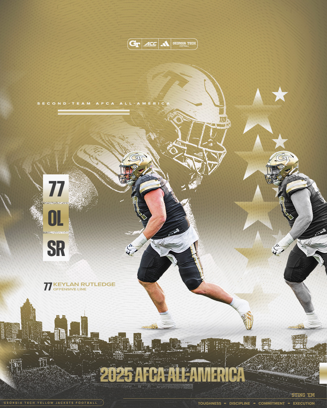 In addition to his AFCA and AP honors, Rutledge has also been named all-America this season by Sports Info Solutions (first team), Walter Camp (second team) and On3 (second team) this season. He was also named first-team all-America by SIS last season, and is the Yellow Jackets’ first all-American in consecutive years since OL Omoregie Uzzi in 2011 and 2012 and Tech’s first back-to-back first-team honoree since College and Pro Football Hall of Fame WR Calvin Johnson in 2005 and 2006.