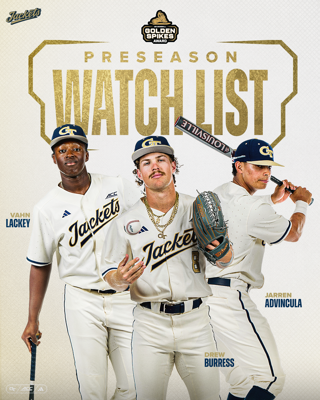 THE FLATS – A national-best three Yellow Jackets have been named on the USA Baseball Golden Spikes Award preseason watch list, USA Baseball announced today. Junior CF Drew Burress (Houston County, Ga./Houston County HS), junior C Vahn Lackey (Suwanee, Ga./Collins Hill HS) and junior 2B Jarren Advincula (Santa Clara, Calif./Cal/ Archbishop Mitty HS) each earned a spot on the 55-player list for best amateur baseball player in the nation for the 2026 season. Georgia Tech is the only program in the nation with three players on the watch list.