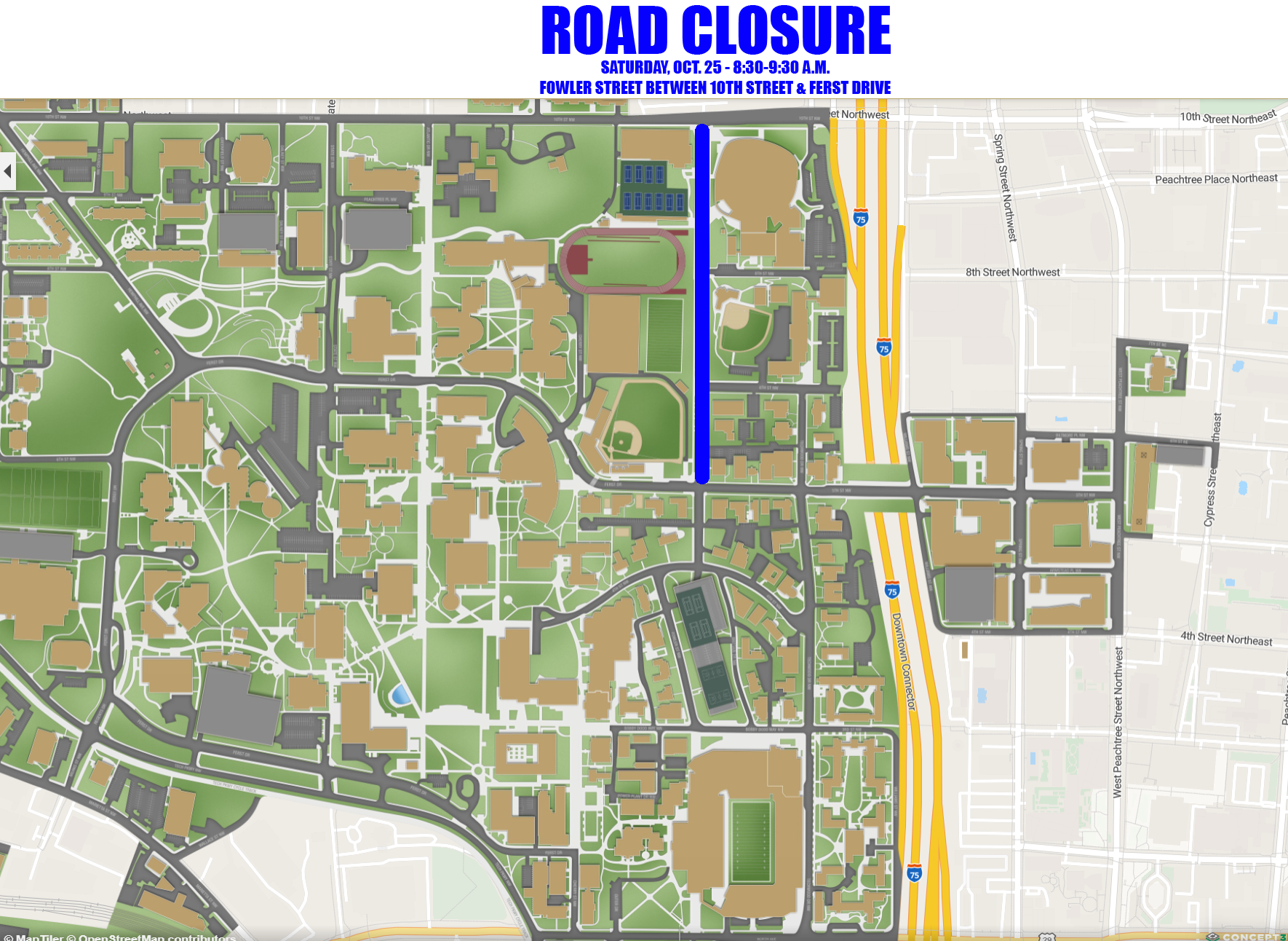 During this time, fans that traditionally utilize Fowler Street between 10th Street and Ferst Drive to access their parking areas must use alternative routes. See map below for road closure in blue.