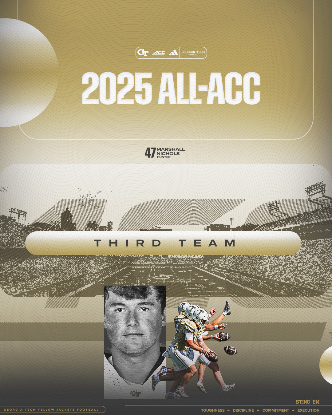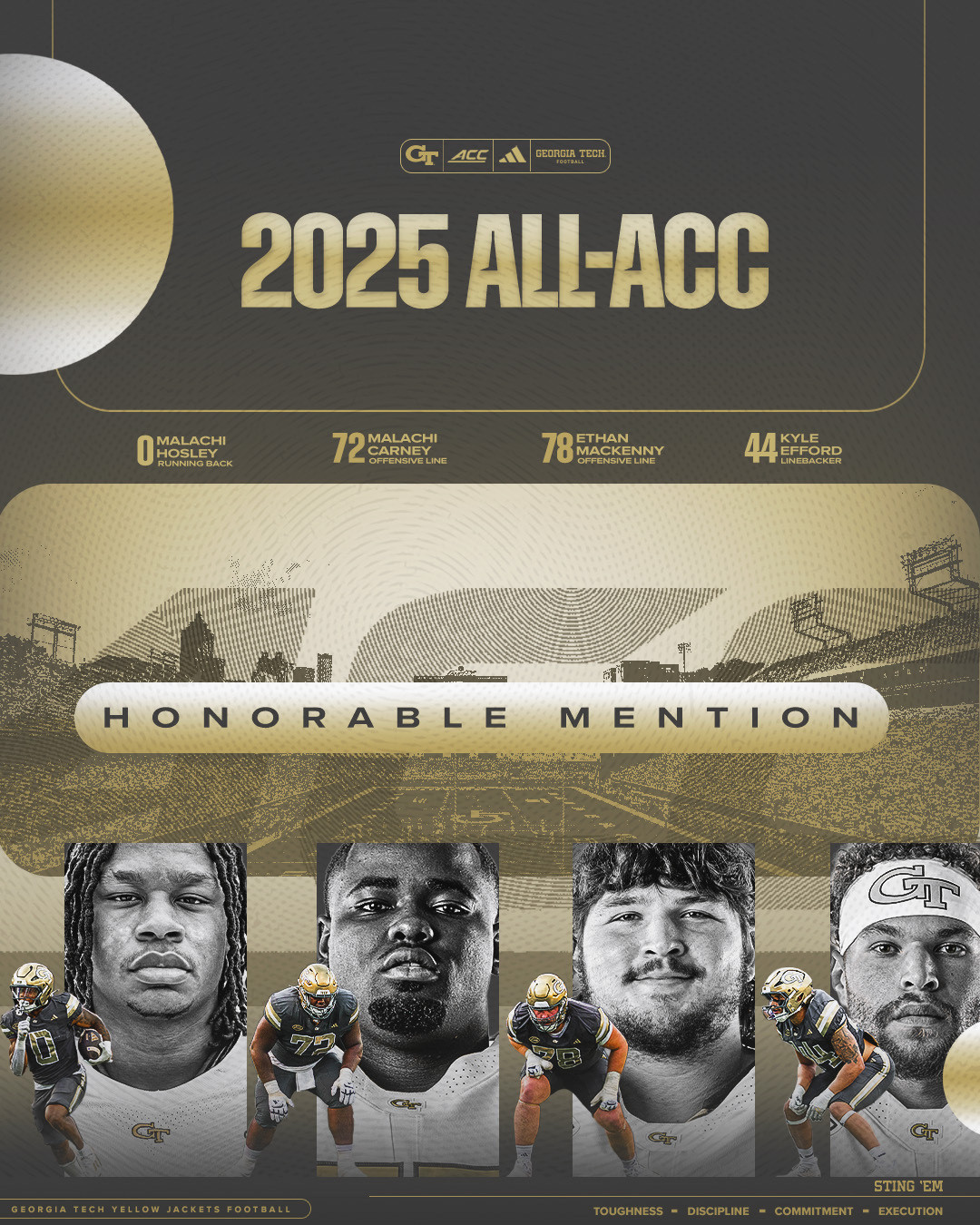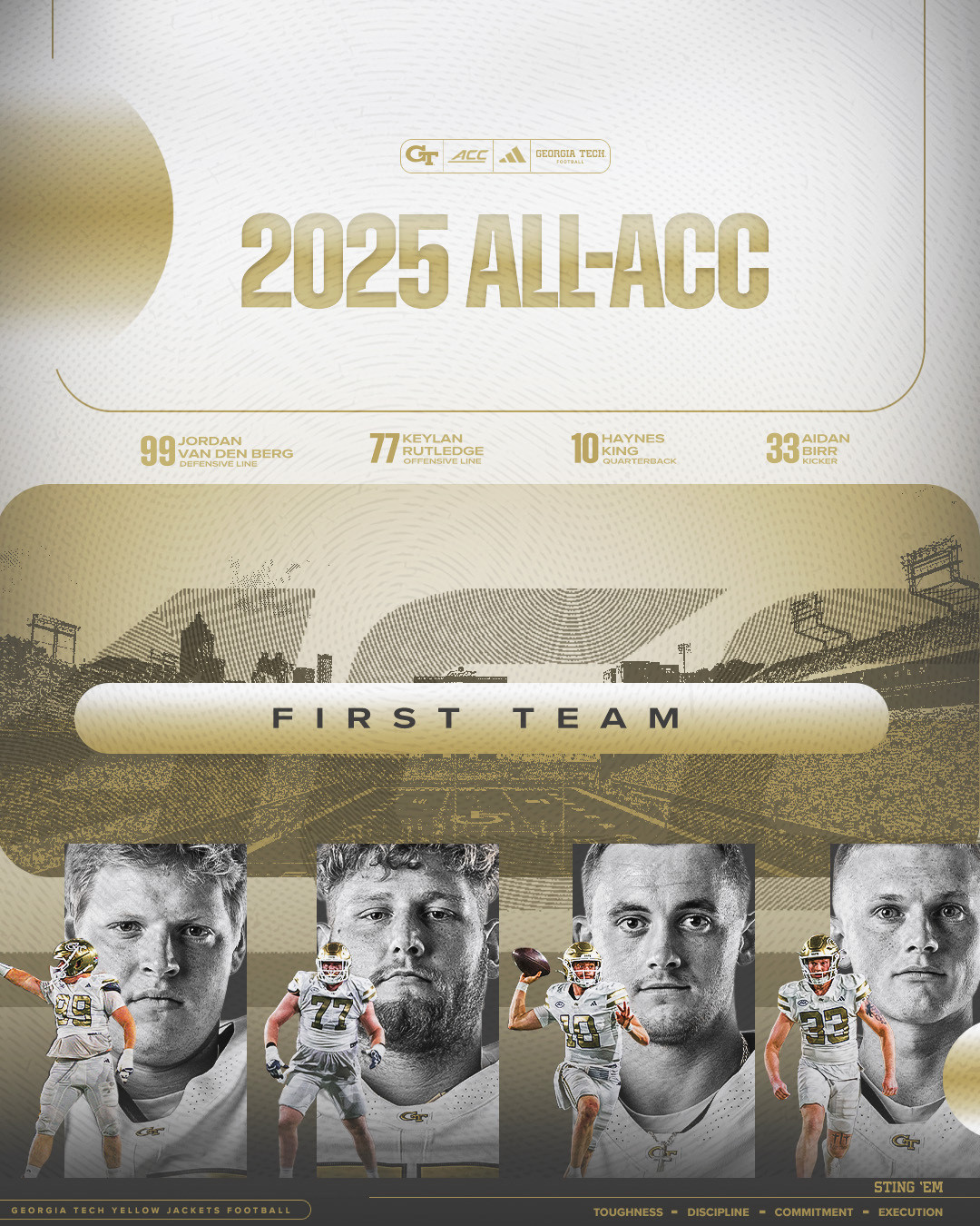 THE FLATS – Led by four first-team honorees – Georgia Tech’s most in 16 years – nine Yellow Jackets have earned all-Atlantic Coast Conference recognition in 2025, the ACC announced on Tuesday.