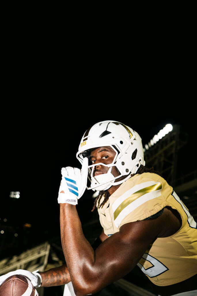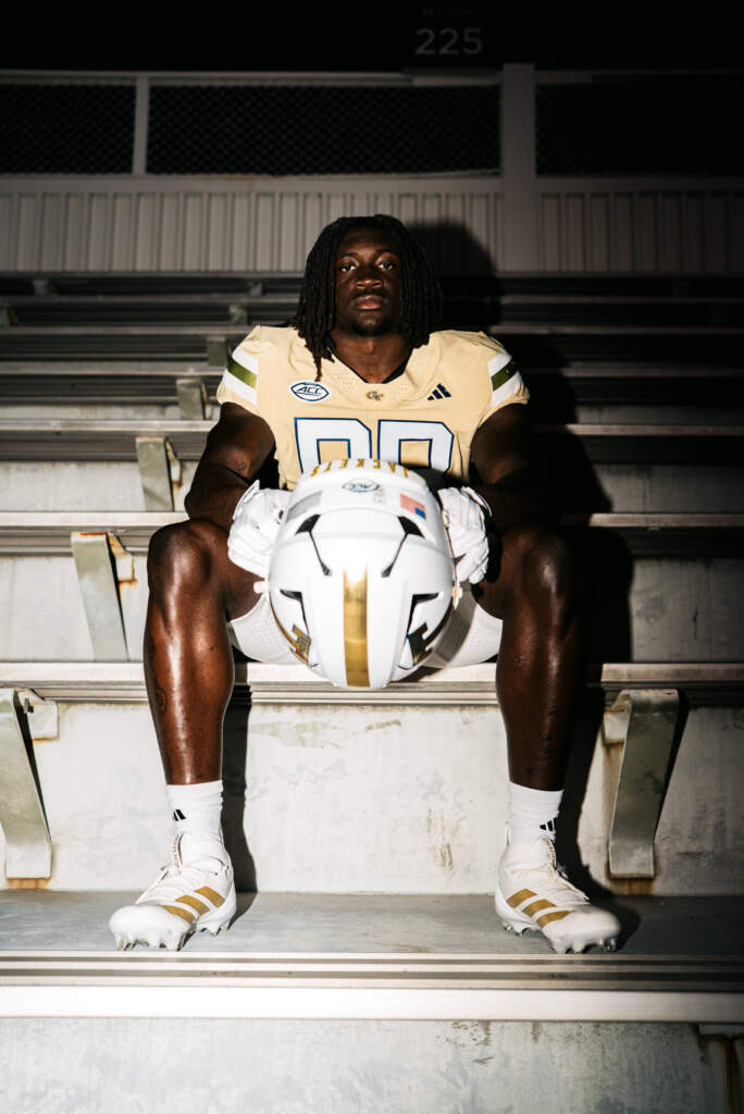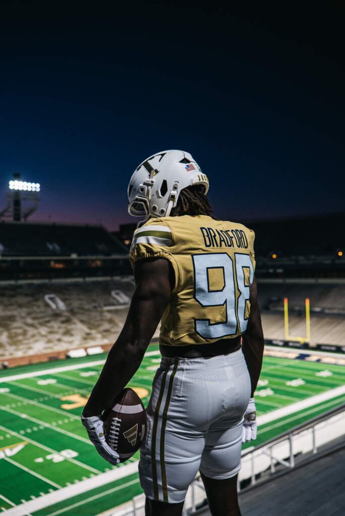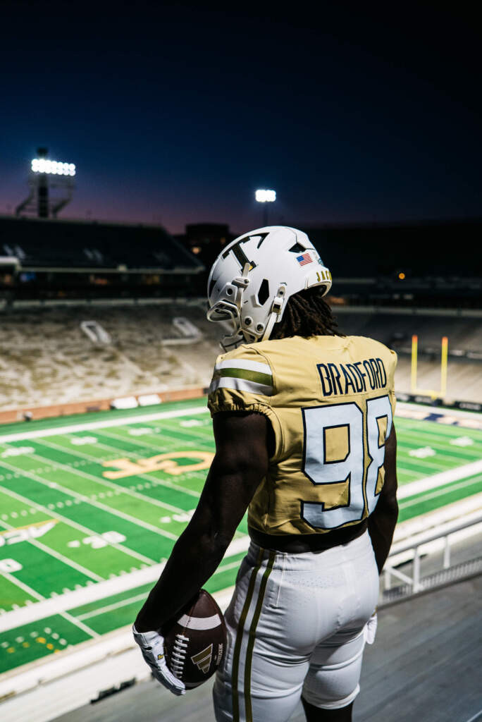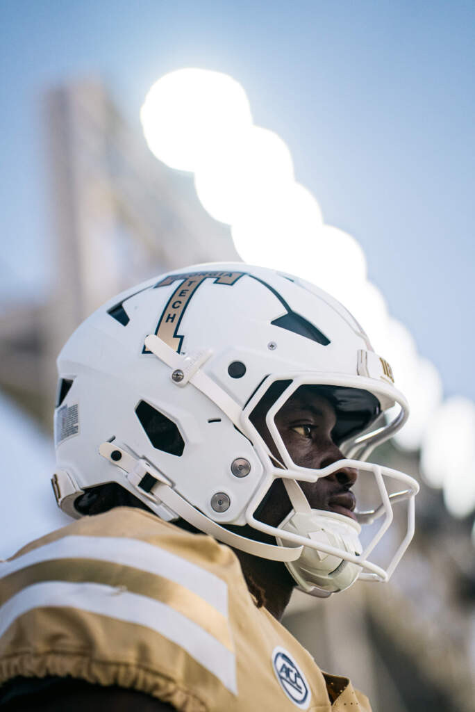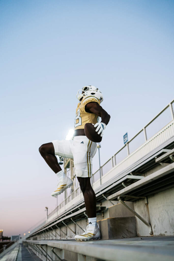 Amontrae Bradford unveils Georgia Tech's homecoming threads featuring the retro Block T logo on a white helmet