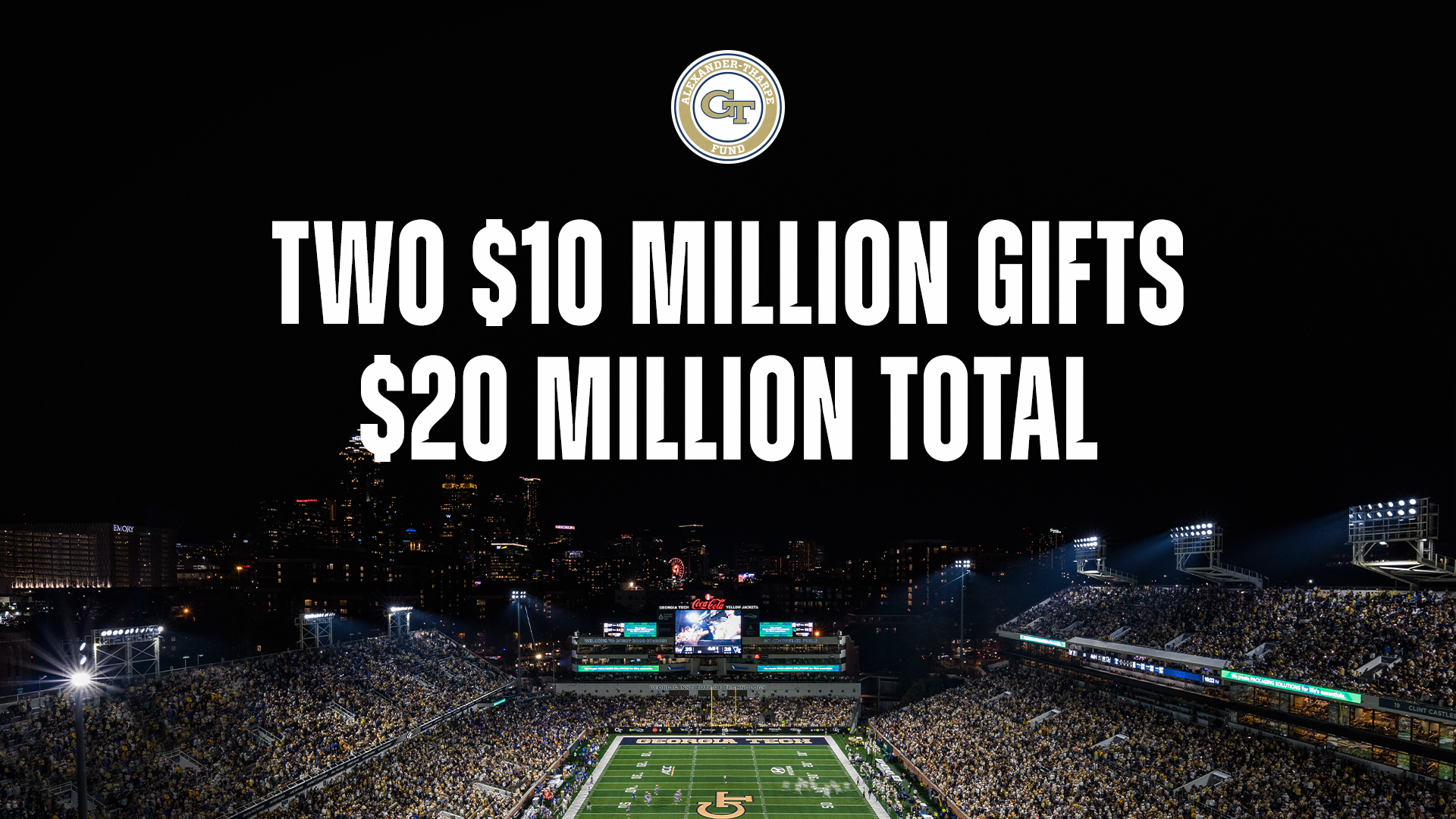 THE FLATS – Two generous, anonymous families have each given $10 million gifts to support Georgia Tech athletics’ Full Steam Ahead initiative and the Yellow Jackets’ football program, Tech vice president and director of athletics Ryan Alpert has announced.