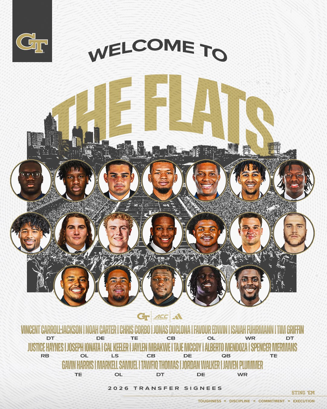 All 19 student-athletes have enrolled at Georgia Tech and are slated to participate in offseason football activities, including winter workouts and spring practice.