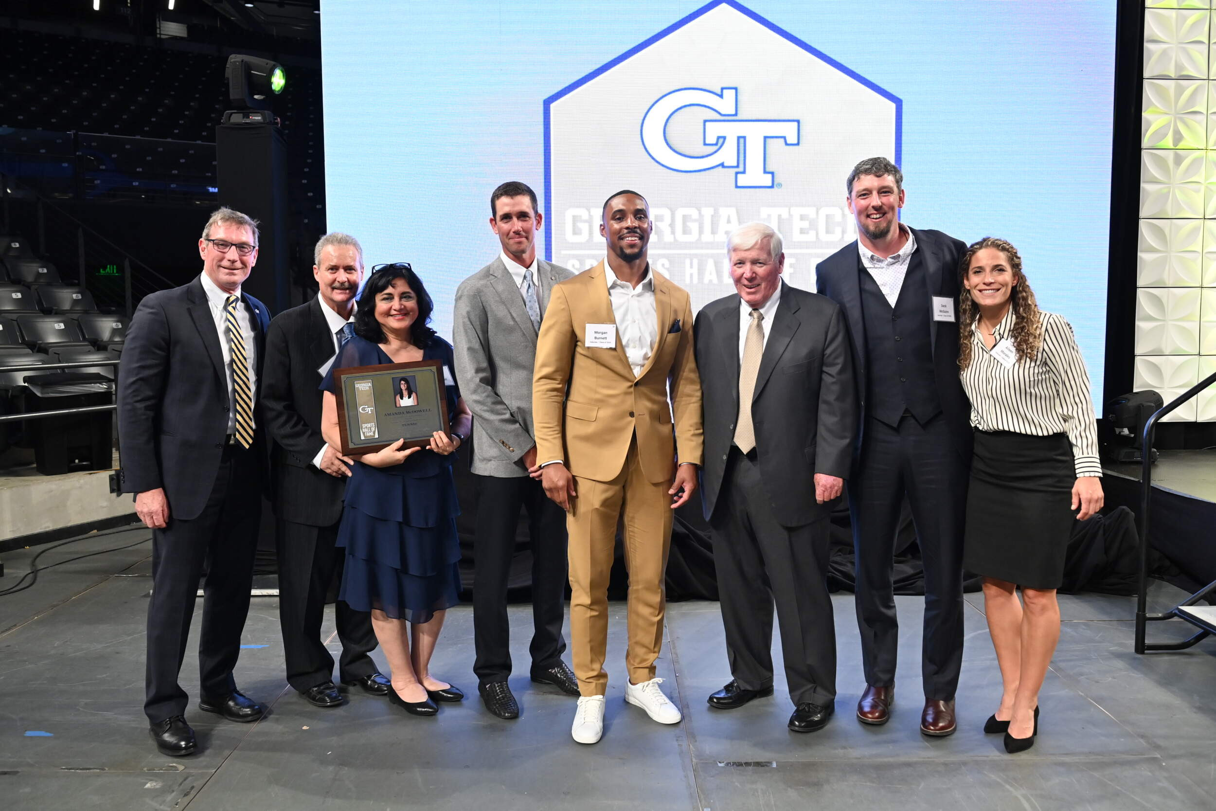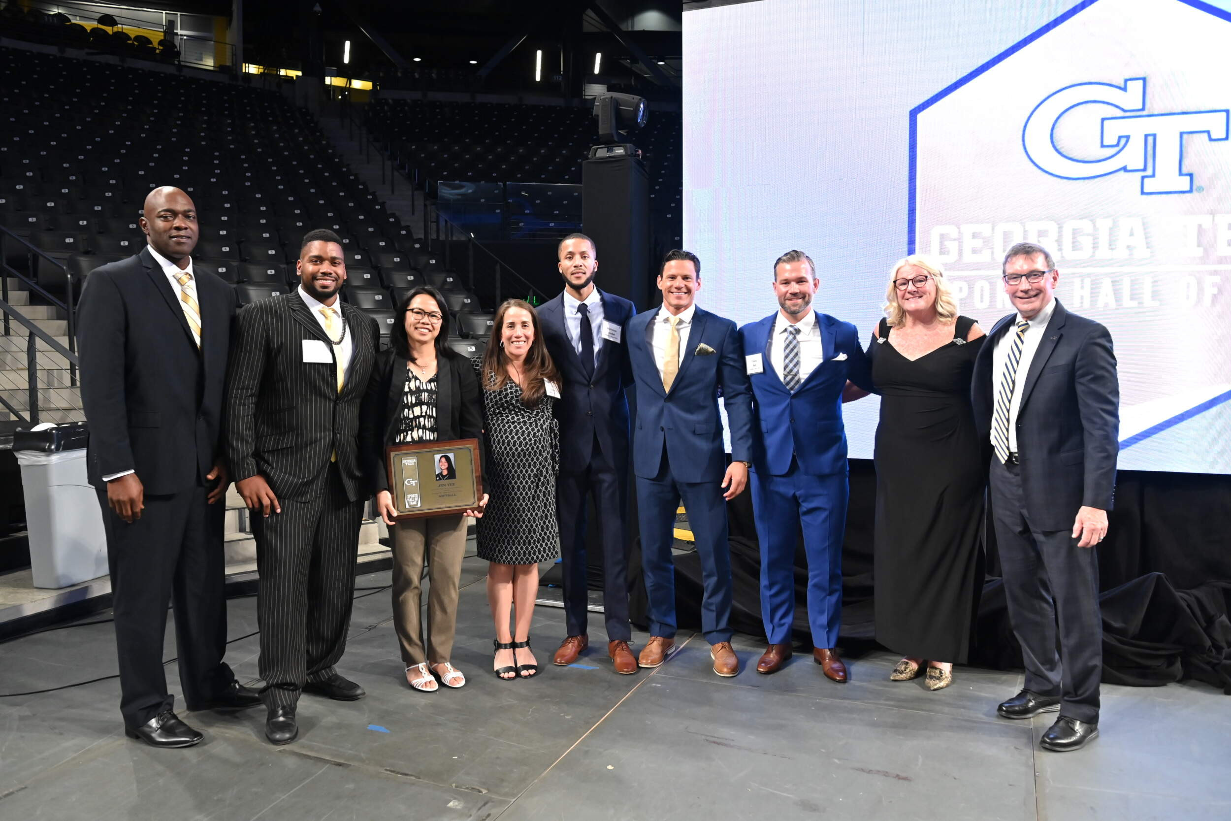 Class of 2020 (from left) – director of athletics Todd Stansbury, Tom and Nelu McDowell, accepting for Amanda McDowell (women’s tennis), Chesson Hadley (golf), Morgan Burnett (football), George O’Leary (head football coach), Deck McGuire (baseball), Aileen Morales (softball).