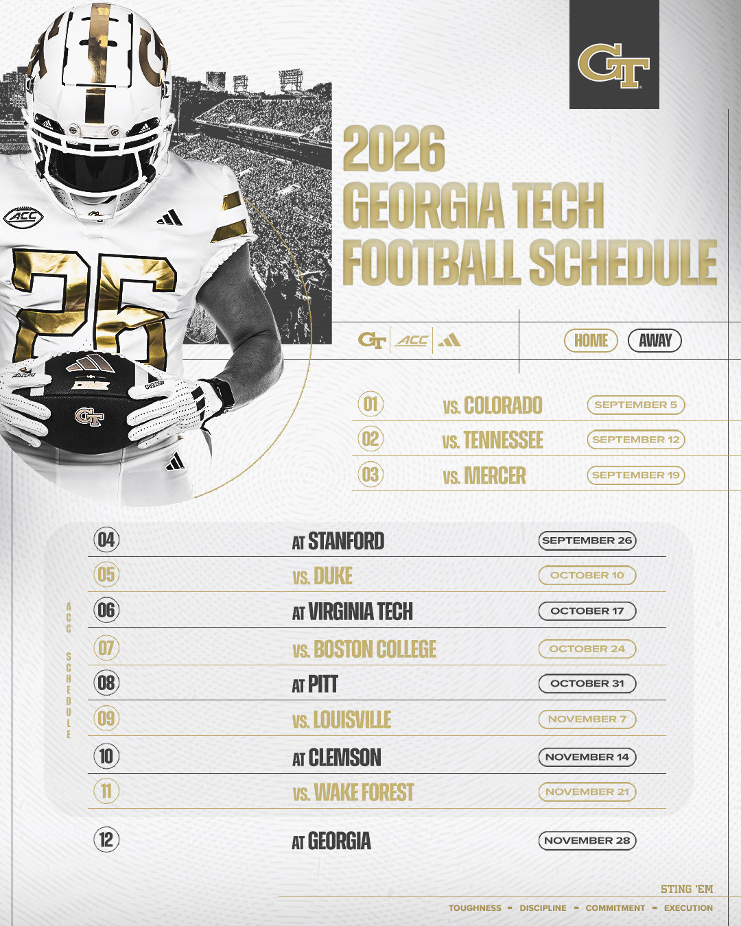THE FLATS – Georgia Tech football’s 12-game regular-season schedule for 2026, which includes seven games at Bobby Dodd Stadium at Hyundai Field, was revealed by the Atlantic Coast Conference on Monday. The Yellow Jackets’ highly anticipated seven-game home slate begins with premium non-conference showdowns versus Colorado (Sept. 5) and Tennessee (Sept. 12), and includes conference battles against defending ACC champion Duke (Oct. 10) and 2025 bowl winners Louisville (Nov. 7) and Wake Forest (Nov. 21).