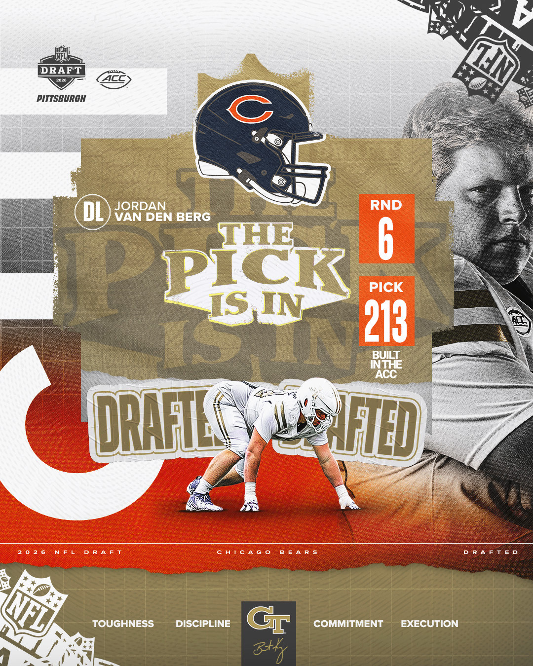 THE FLATS – Georgia Tech defensive tackle Jordan van den Berg (Johannesburg, South Africa/Providence (Ga.) Christian Academy) made history on Saturday when the Chicago Bears selected him in the sixth round (No. 213) of the 2026 National Football League Draft.