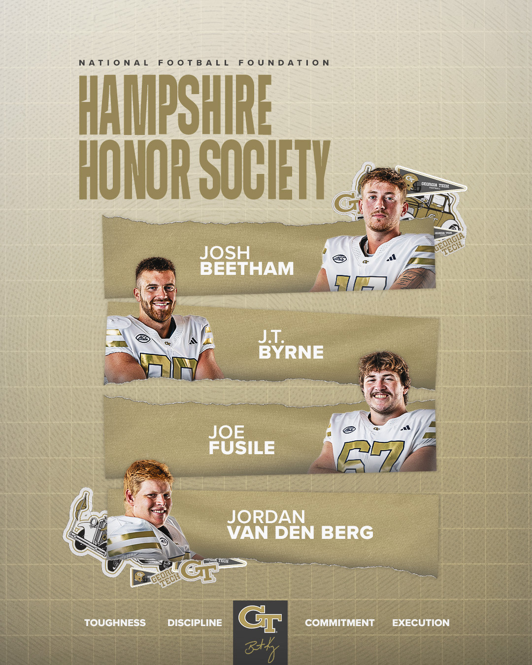THE FLATS – Georgia Tech tight ends Josh Beetham (Yorkville, Ill./Yorkville H.S.) and J.T. Byrne (Carmel-by-the-Sea, Calif./Carmel H.S.), offensive lineman Joe Fusile (Richmond Hill, Ga./Richmond Hill H.S.) and defensive lineman Jordan van den Berg (Johannesburg, South Africa/Providence Christian Academy (Ga.)) received one of college football’s most prestigious recognitions on Wednesday when they were named to the 2026 class of the National Football Foundation’s Hampshire Honor Society.
