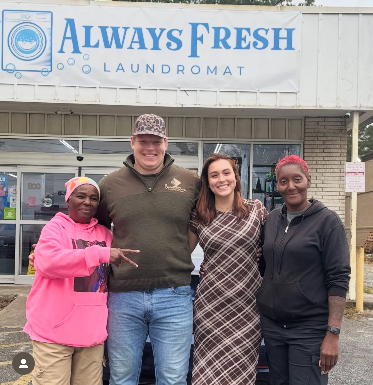 Jordan van den Berg with Janice (left), girlfriend Ilanae (middle right) and Angie (right) outside of Always Fresh laundromat