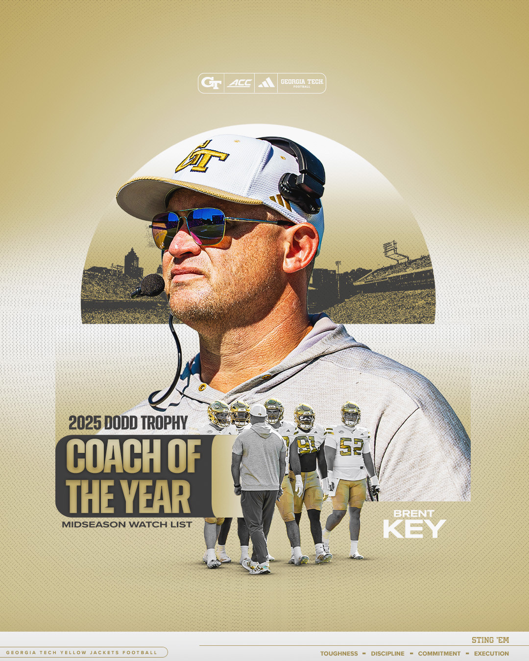 THE FLATS – Georgia Tech head coach Brent Key is one 24 head coaches on the official midseason watch list for the 2025 Dodd Trophy. Named in honor of legendary Georgia Tech head coach Bobby Dodd, the Dodd Trophy is presented to college football’s Coach of the Year who stands out for his commitment to the three pillars of Dodd’s coaching philosophy – scholarship, leadership and integrity.