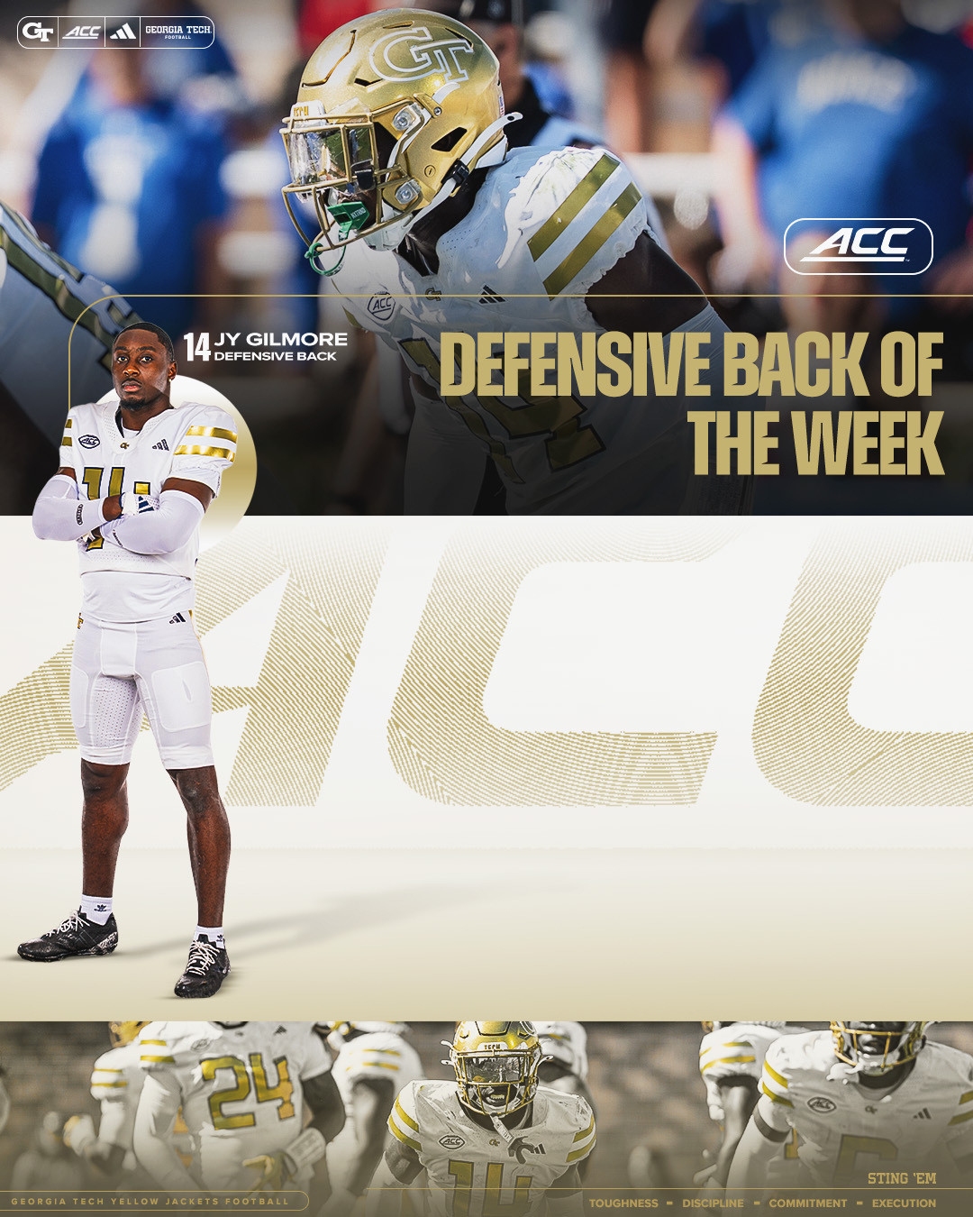 Gilmore’s 11 tackles led all players in Saturday’s game and was his most since transferring to Tech from Georgia State prior to this season. He helped lead a Georgia Tech defensive effort that held Duke, which was averaging 36.5 points per game, to less than half of its season scoring average and a season-low 68 rushing yards. Gilmore and the Yellow Jackets’ defense were also especially stout in the second half, when they held the Blue Devils to just 66 yards and no points over three series that spanned 14:53, which allowed the Jackets’ offense to score on four-straight possessions and turn the 10-7 deficit into the 27-10 lead.