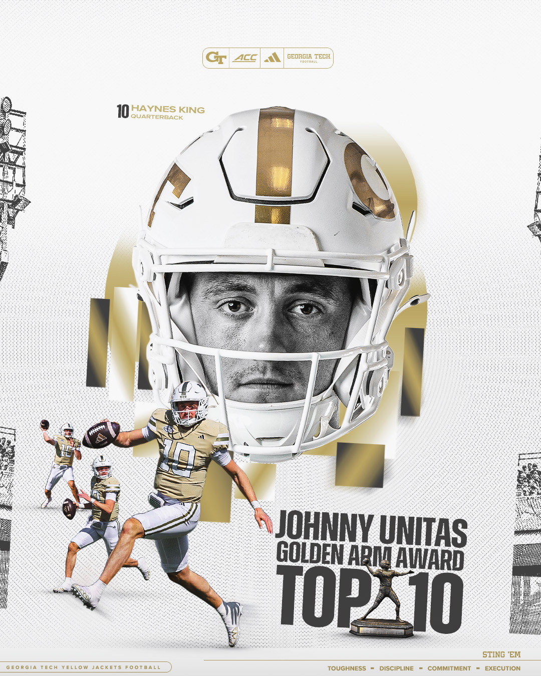 THE FLATS –Georgia Tech quarterback Haynes King (Longview, Texas/Longview H.S.) has made the top 10 list for the 2025 Johnny Unitas Golden Arm Award, which honors college football’s top upperclassman quarterback who best exemplifies character, leadership and excellence, on and off the field.
