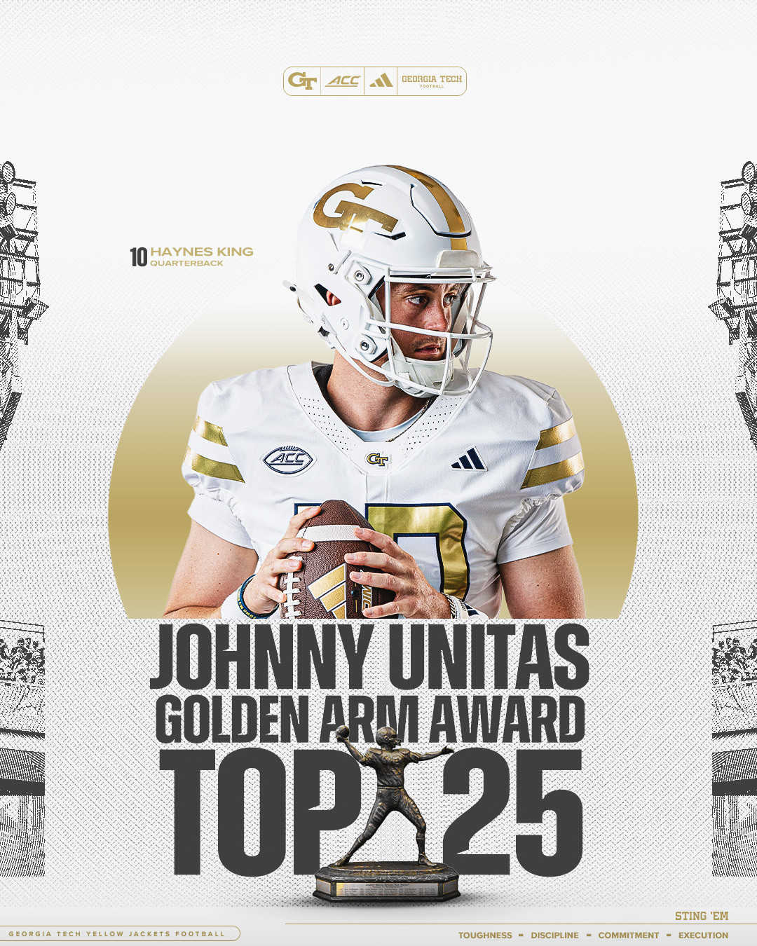 THE FLATS – Georgia Tech quarterback Haynes King (Longview, Texas/Longview) was named to the top-25 list for the 2025 Johnny Unitas Golden Arm Award on Wednesday. The Johnny Unitas Golden Arm Award is presented annually to college football’s top senior quarterback.