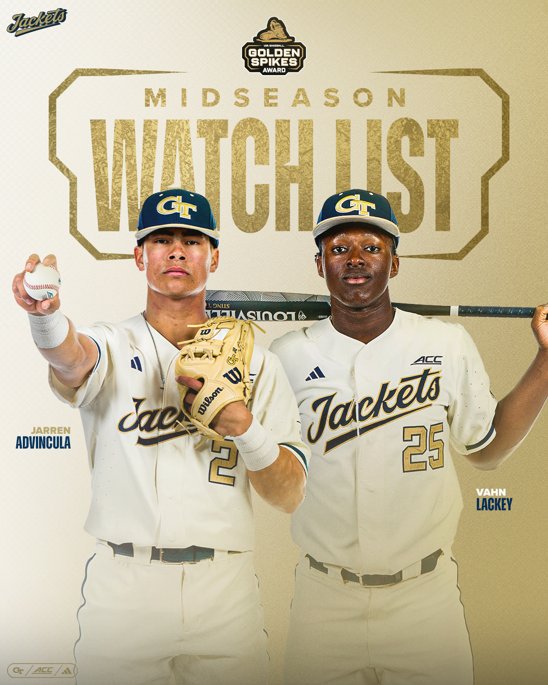 THE FLATS – Two Yellow Jackets have been named on the USA Baseball Golden Spikes Award midseason watch list, USA Baseball announced today. Junior C Vahn Lackey (Suwanee, Ga./Collins Hill HS) and junior 2B Jarren Advincula (Santa Clara, Calif./Cal/ Archbishop Mitty HS) each earned a spot on the 45-player list for best amateur baseball player in the nation for the 2026 season.