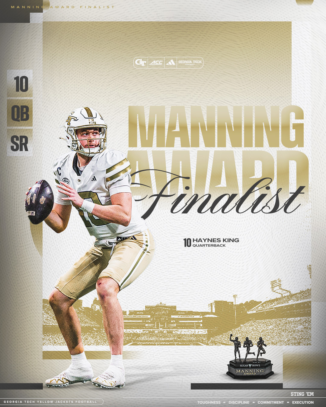THE FLATS – Georgia Tech quarterback Haynes King (Longview, Texas/Longview H.S.) has added more national honors to his record-breaking 2025 season as he was named a finalist for the Manning Award and a semifinalist for the Earl Campbell Tyler Rose Award, it was announced today.