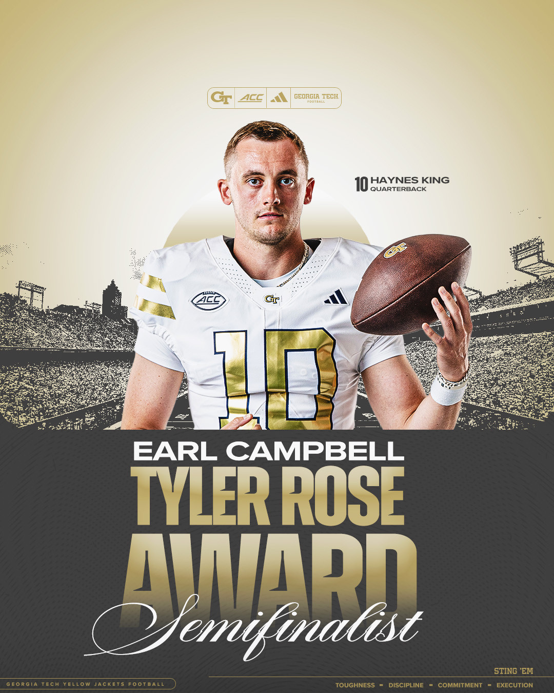 King was named the Earl Campbell Tyler Rose Award Player of the Week – as well as the Maxwell National Player of the Week, Manning Award Star of the Week and ACC Quarterback of the Week – for his performance in Georgia Tech’s season opening victory at Colorado on Aug. 29 in which King totaled 299 yards of offense (156 rushing, 143 passing) and a career-high-tying three touchdowns, including the game-winning 45-yard score with 1:07 left in the game. He is one of two representatives from the ACC to be named a semifinalist, alongside Virginia’s Chandler Morris (Highland Park, Texas) and one of nine total quarterbacks to be up for the award.