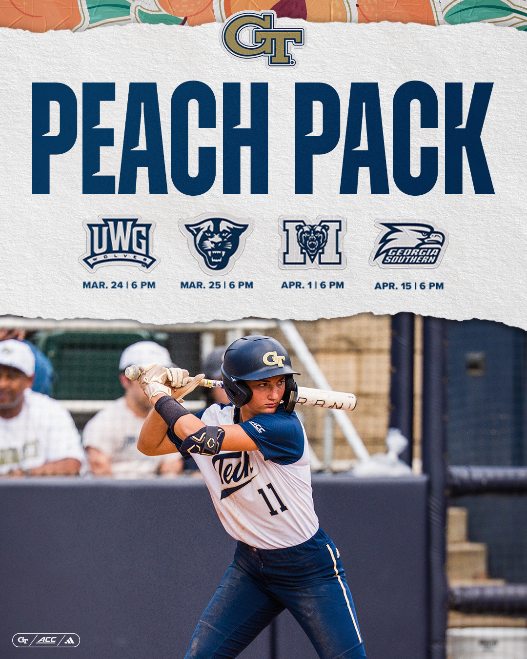 THE FLATS – Georgia Tech softball is excited to announce the Peach Pack which allows fans to catch the Yellow Jackets take on fellow Georgia teams West Georgia (March 24), Georgia State (March 25), Mercer (April 1), Georgia Southern (April 15).