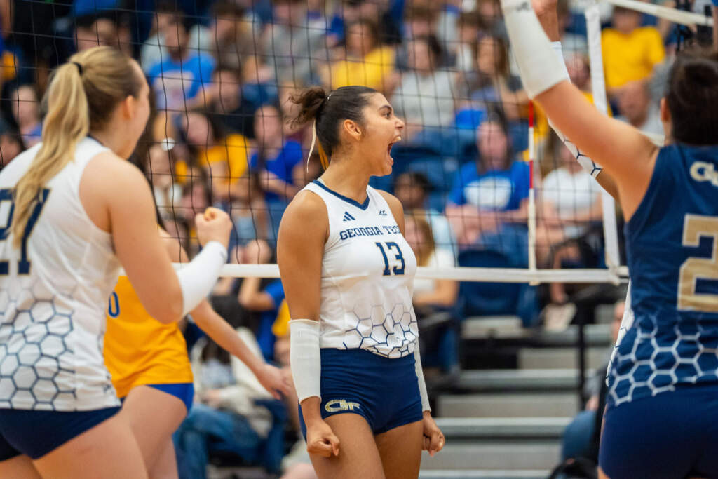 - Set three was a completely different story as Tech improved its stats across the board, posting more kills (14-11), more blocks (11-6), and a higher attack percentage (.296- .138) than Pittsburgh. The third set began with Tech getting a jump on Pitt before the Panthers tied the set 6-6. Regardless of the Panthers being able to get the set tying point, the Jackets were able to constantly stay one point ahead until they outscored Pitt 7-1 to lead the set 16-10. Pitt trailed for the remainder of the set and even brought the set within one point (20-19), but Tech’s heart and grit was enough to carry it to a 25-21 set three win. Senior DeAndra Pierce had an exceptional third set with four kills on five swings for a team high .800 attack percentage. Garibaldi found her stride as well in the third set, also recording four kills and four blocks. Soares was an effective piece in the Tech rotation, being credited with 12 assists on 22 attempts.