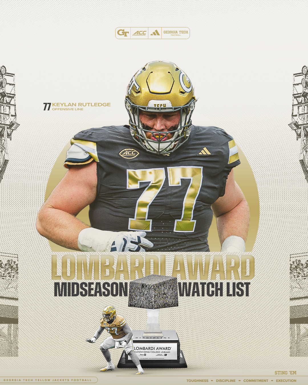 THE FLATS – Georgia Tech senior offensive lineman Keylan Rutledge (Royston, Ga./Franklin County H.S.) is one of 54 premier student-athletes included on the official midseason watch list for the 2025 Lombardi Award. The Lombardi Award honors college football’s top lineman or linebacker.