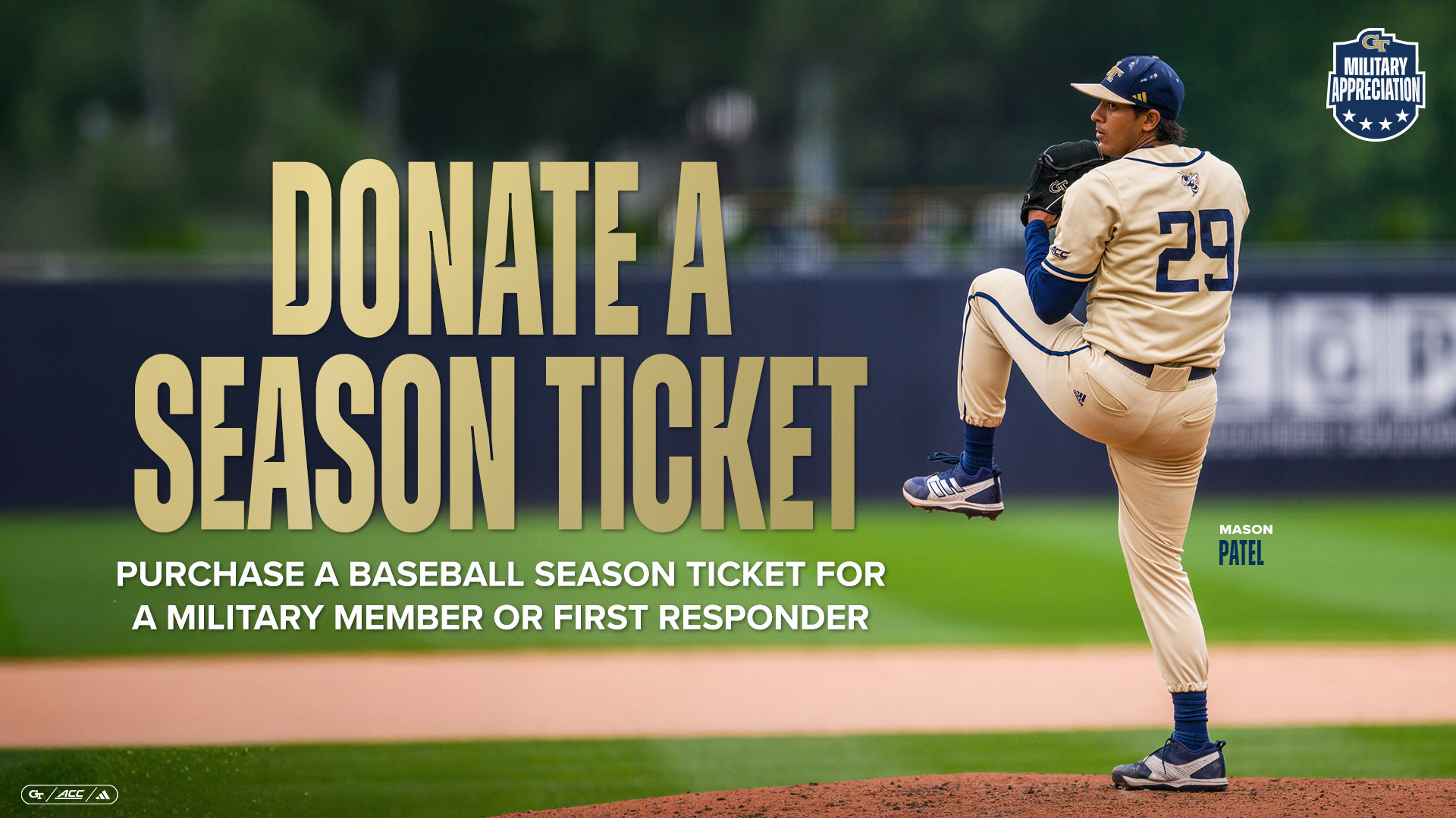 Georgia Tech Baseball is excited to launch its Military and Heroes Appreciation Season Ticket Donation program for the 2026 season. Anyone can purchase a full season ticket for GT Baseball to be donated to a veteran, first responder, or community hero. Baseball season tickets are available to purchase for donation at a discounted price of $150. Click HERE to purchase.