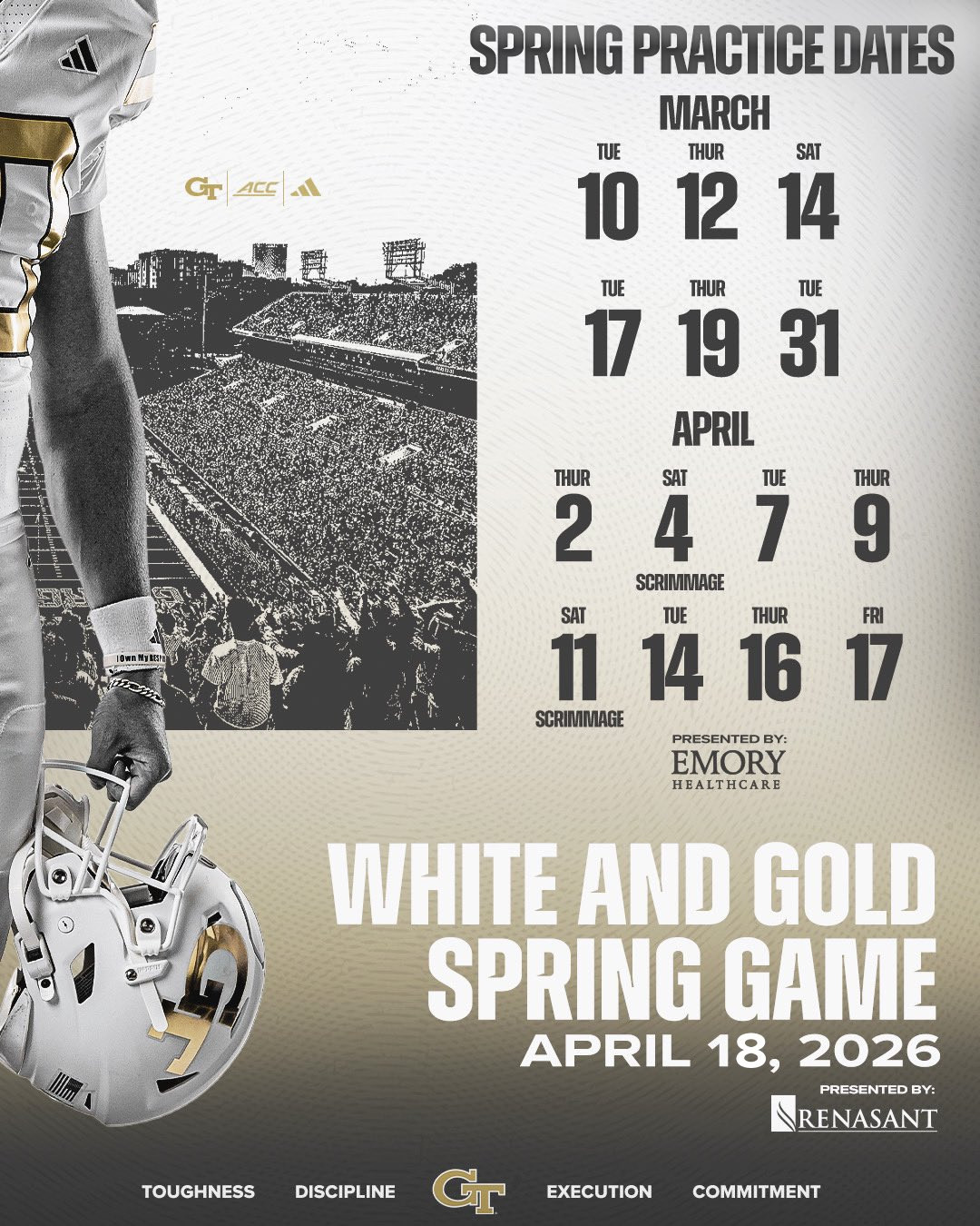 THE FLATS – Georgia Tech football’s 2026 White & Gold Game, presented by Renasant Bank, will be held on Saturday, April 18 at Bobby Dodd Stadium at Hyundai Field. Kickoff is set for 1 p.m. and admission is FREE.