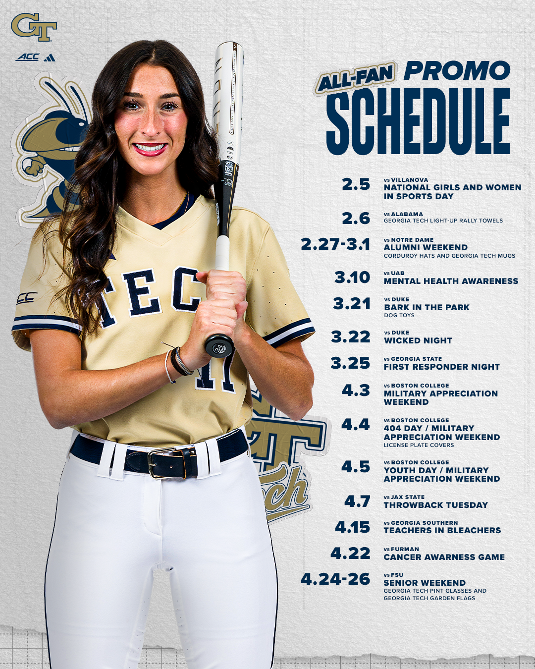 The Jackets start the season strong, opening the 2026 season celebrating National Girls and Women in Sports Day the first day of Buzz Classic (Feb. 5) against Villanova and giving away Georgia Tech light up rally towels the following day (Feb. 6) against Alabama. Tech softball will recognize and embrace its loyal fans as it hosts Mississippi State in a Season Ticket Holder Appreciation game. ACC play begins with a double giveaway against Notre Dame with corduroy hats and GT mugs up for grabs as we welcome our Tech softball alumni back to Mewborn. The Yellow Jackets will bring awareness to a global issue as they will hold the Mental Health Awareness game, Mar. 10.