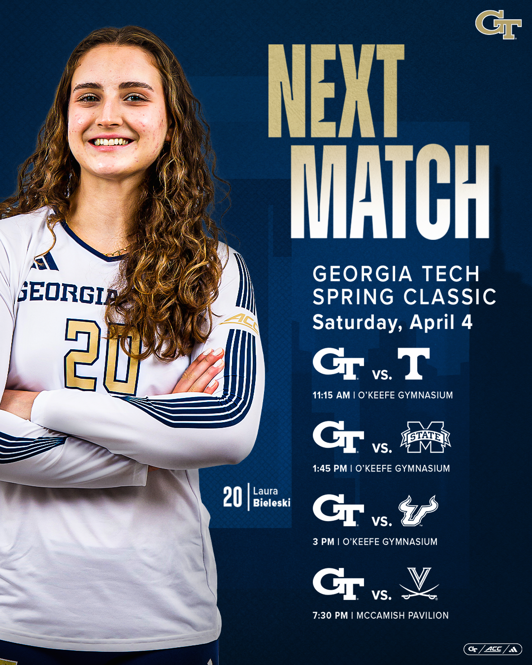 THE FLATS – Georgia Tech volleyball is set to host the annual Georgia Tech Spring Classic on April 4 which features three matches in O’Keefe Gymnasium and one final match in McCamish Pavilion following the LOVB Atlanta vs. Houston match.