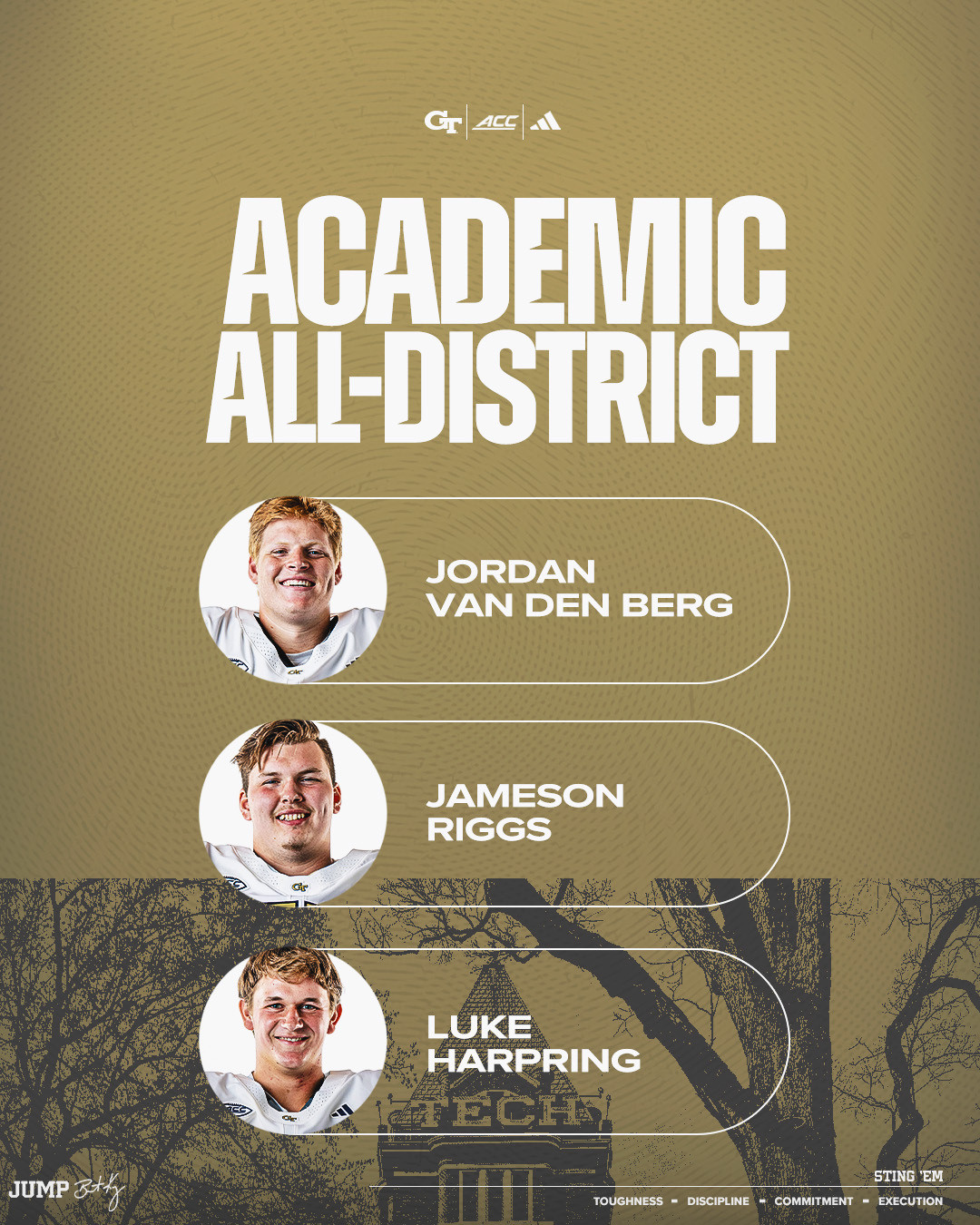 THE FLATS – Three Georgia Tech football student-athletes – defensive lineman Jordan van den Berg (Johannesburg, South Africa/Providence Christian Academy (Ga.)), tight end Luke Harpring (Atlanta, Ga./Marist School) and offensive lineman Jameson Riggs (Douglasville, Ga./Hiram H.S.) – were named academic all-district by College Sports Communicators on Tuesday.