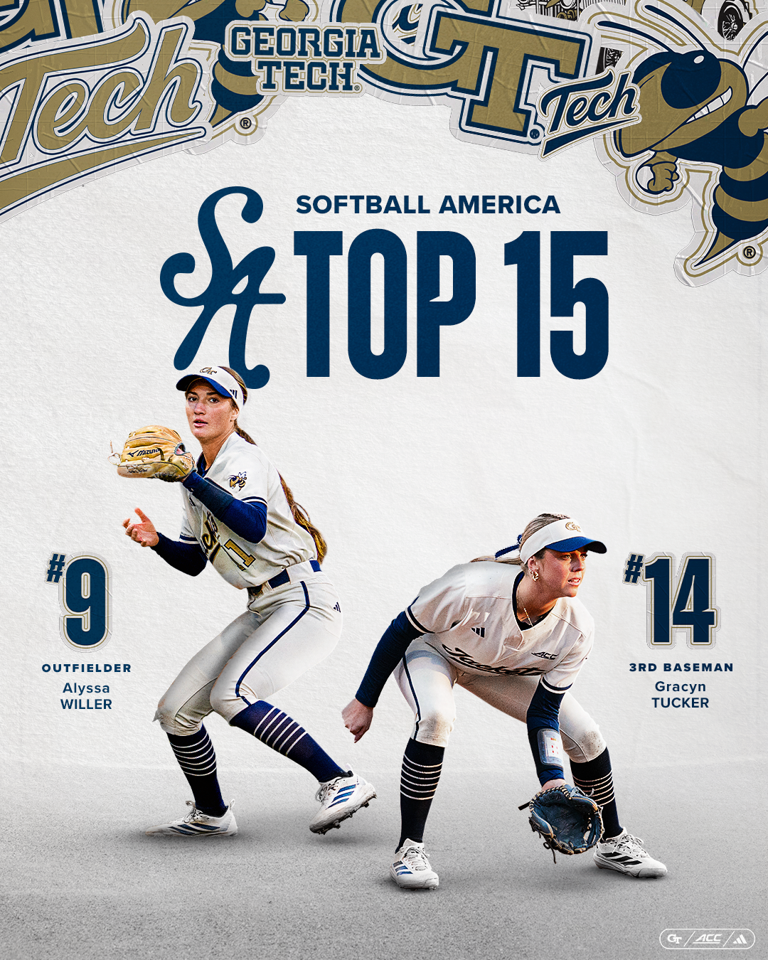 THE FLATS – Georgia Tech softball (16-11, 4-2 ACC) saw a pair of Yellow Jackets honored in the March edition of Softball America’s Position Rankings as was announced by the association at the beginning of the month. After the first month of action in the 2026 season, left fielder Alyssa Willer was ranked ninth and first baseman Gracyn Tucker was ranked 14th.