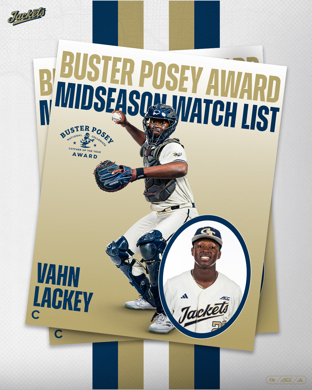 THE FLATS – Junior catcher Vahn Lackey (Suwanee, Ga./Collins Hill HS) has been named to the 2026 Buster Posey National Collegiate Catcher of the Year Award Midseason Watch List, the Wichita Sports Commission announced today. Lackey, a 2025 semifinalist for the award, is hoping to become Georgia Tech’s third winner in the last eight years, alongside Kevin Parada in 2022 and Joey Bart in 2018. GT is one of three programs with multiple Buster Posey Award winners.